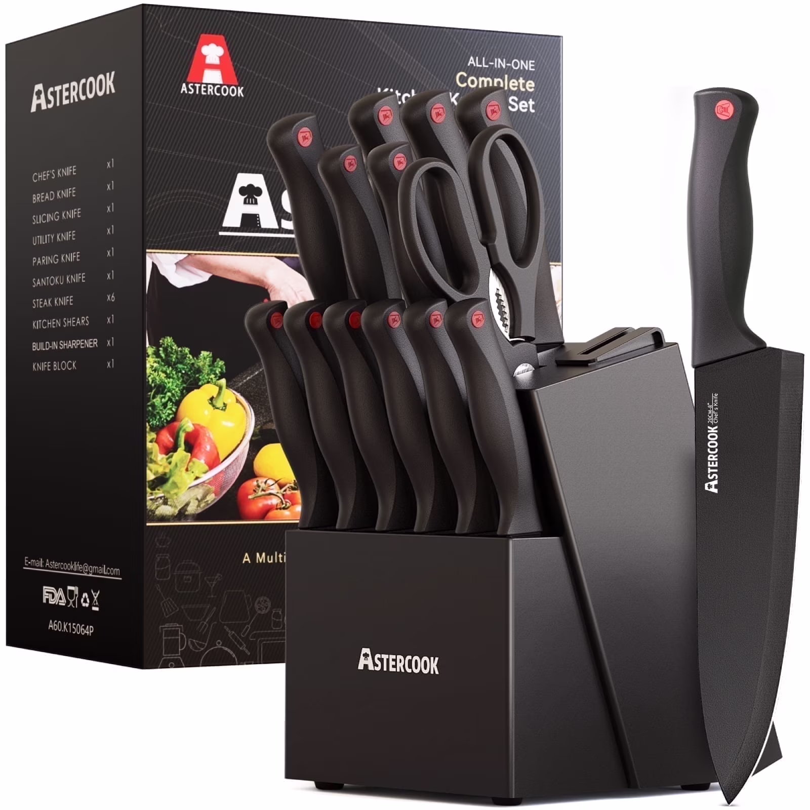 Astercook 14 Pcs Knives Block Set with Built-in Sharpener